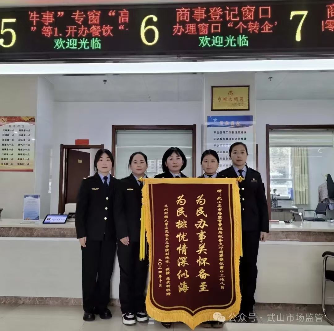 一面锦旗,是一种肯定,更是一次鞭策。近年来,武山县市场监管局将“高效办事”作为优化政务服务、提升行政效能的重要抓手,注重一线服务,提升服务质量,把为办事群众提供优质服务作为基本要求,积极为企业提供优质、高效、热情的服务。下一步,武山县市场监管局将进一步健全完善“高效办成一件事”重点事项清单管理机制和常态化推进机制,持续强化规范化建设,进一步提高服务水平,用政务服务的“小小窗口”为企业群众提供暖、快、优的“满满服务”,助力营商环境持续优化。