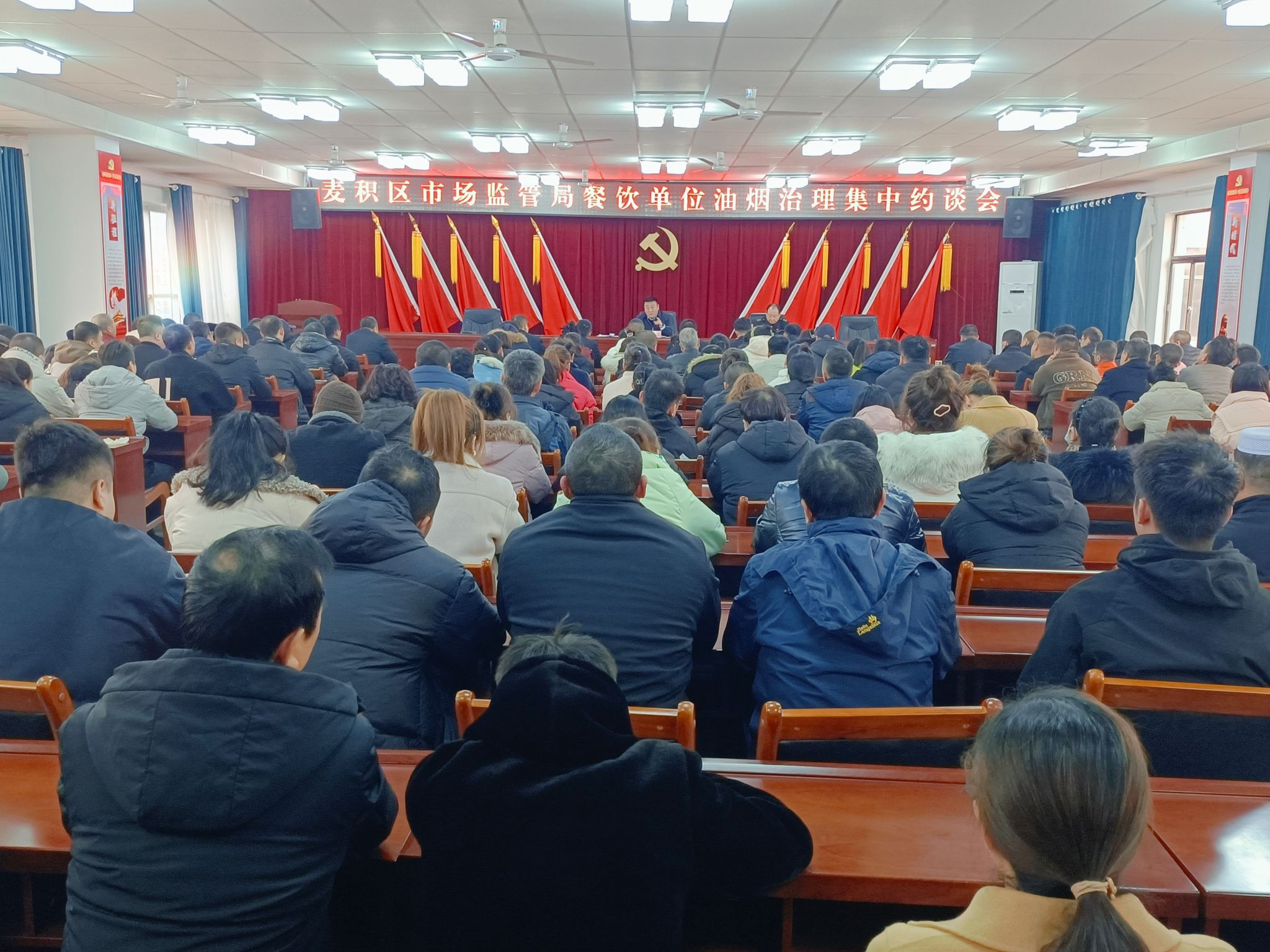 近日,麦积区市场监管局组织召开餐饮单位油烟治理集中约谈会。麦积区市场监管局党组书记、局长张海斌,局分管领导、各市场监管所所长,桥南辖区、马跑泉辖区(主城区)餐饮户负责人共计200余人参加会议。