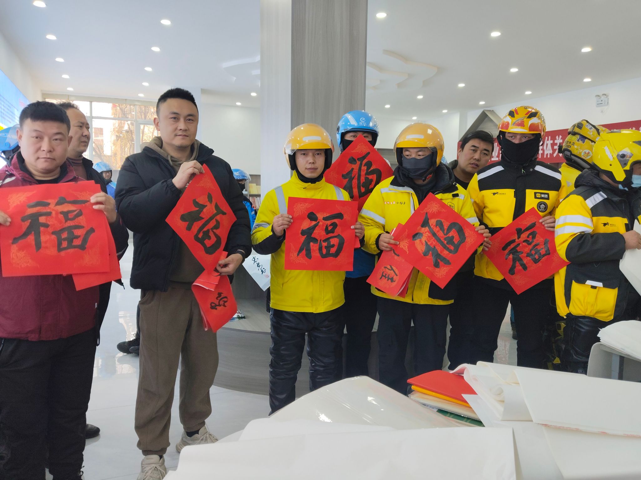 活动中,对外卖员、快递员、货车司机等100名新就业群体代表进行了慰问,现场发放了手工挂面、温暖大礼包等慰问品。邀请区检察院工作人员开展了普法宣传、法律咨询服务。还邀请市区书画名家现场挥毫,给外卖员、快递员、货车司机等新就业群体送福字、送对联、送书画。在2025年春节即将来临之际,将党组织的温暖和新年祝福送到了外卖送餐员、快递员、货车司机等新就业群体的身边,赢得了新就业群体代表的一致好评。