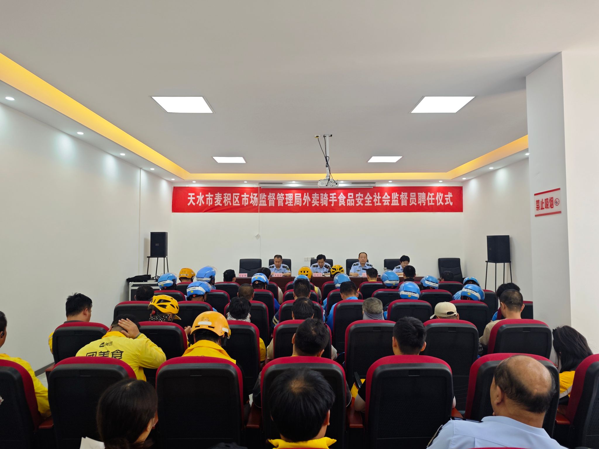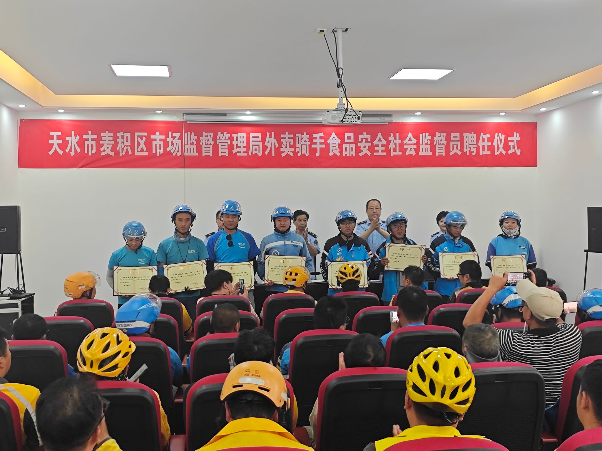 为进一步加强网络餐饮食品安全监管,充分发动外卖骑手参与食品安全社会共治,切实保障广大消费者合法权益, 6月26日,天水市麦积区市场监管局举行麦积区首批“外卖骑手”食品安全社会监督员聘任仪式。区市场监管局相关负责人,“外卖骑手”食品安全社会监督员、外卖骑手代表,约60余人参加仪式。