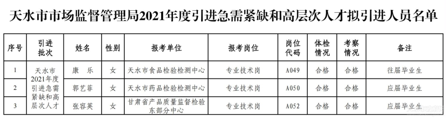 附件:天水市市场监督管理局2021年度引进急需紧缺和高层次人才拟引进人员名单