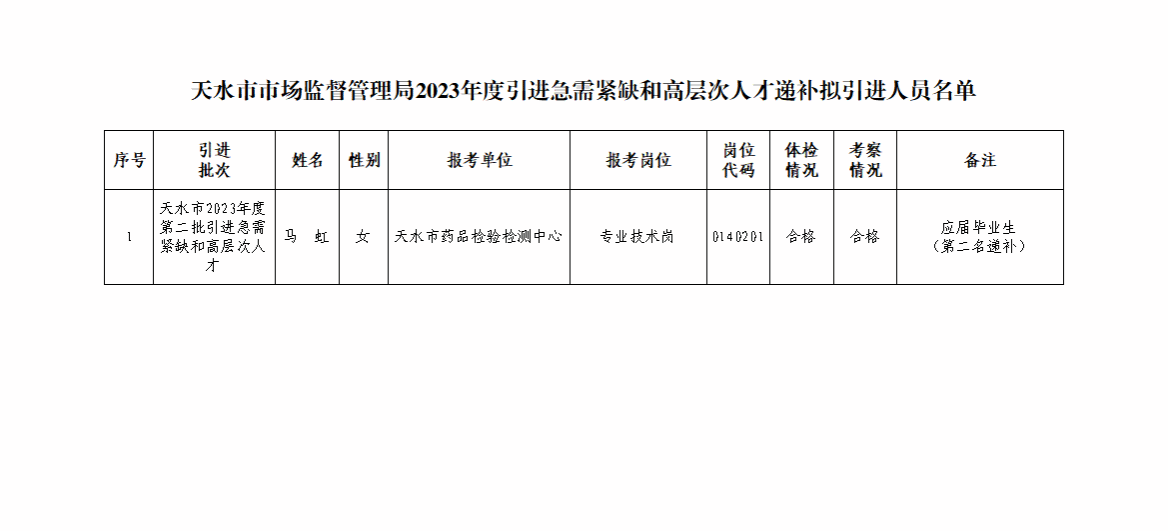 附件:天水市市场监督管理局2023年度引进急需紧缺和高层次人才递补拟引进人员名单