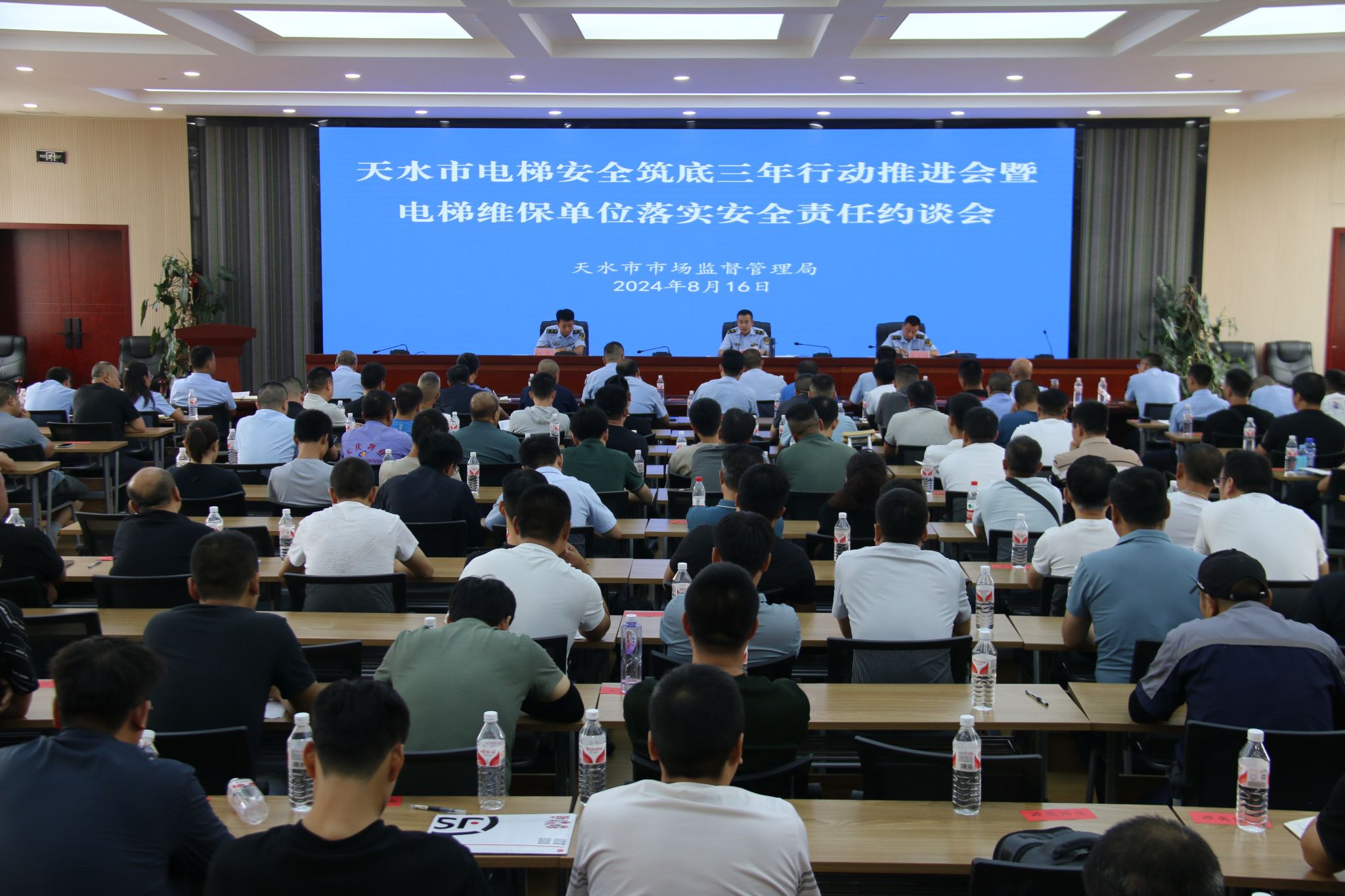 为全面提升电梯维护保养质量,靠实电梯维保单位安全责任,及时消除安全隐患,保障群众乘梯安全,近日,天水市市场监管局党组成员、副局长殷守彪主持召开全市电梯安全筑底三年行动推进会暨电梯维保单位落实安全责任约谈会。约谈会上,学习了《中华人民共和国特种设备安全法》《特种设备生产单位落实质量安全主体责任监督管理规定》《电梯维护保养规则》等法律法规、安全技术规范,通报了全市电梯安全筑底三年行动开展情况和存在的问题,发布了《天水市电梯维保单位落实安全主体责任告知书》,解读了《天水市电梯维保单位责任清单》《天水市电梯维保单位负面清单》,对扎实深入开展电梯安全筑底三年行动进行再动员、再部署。