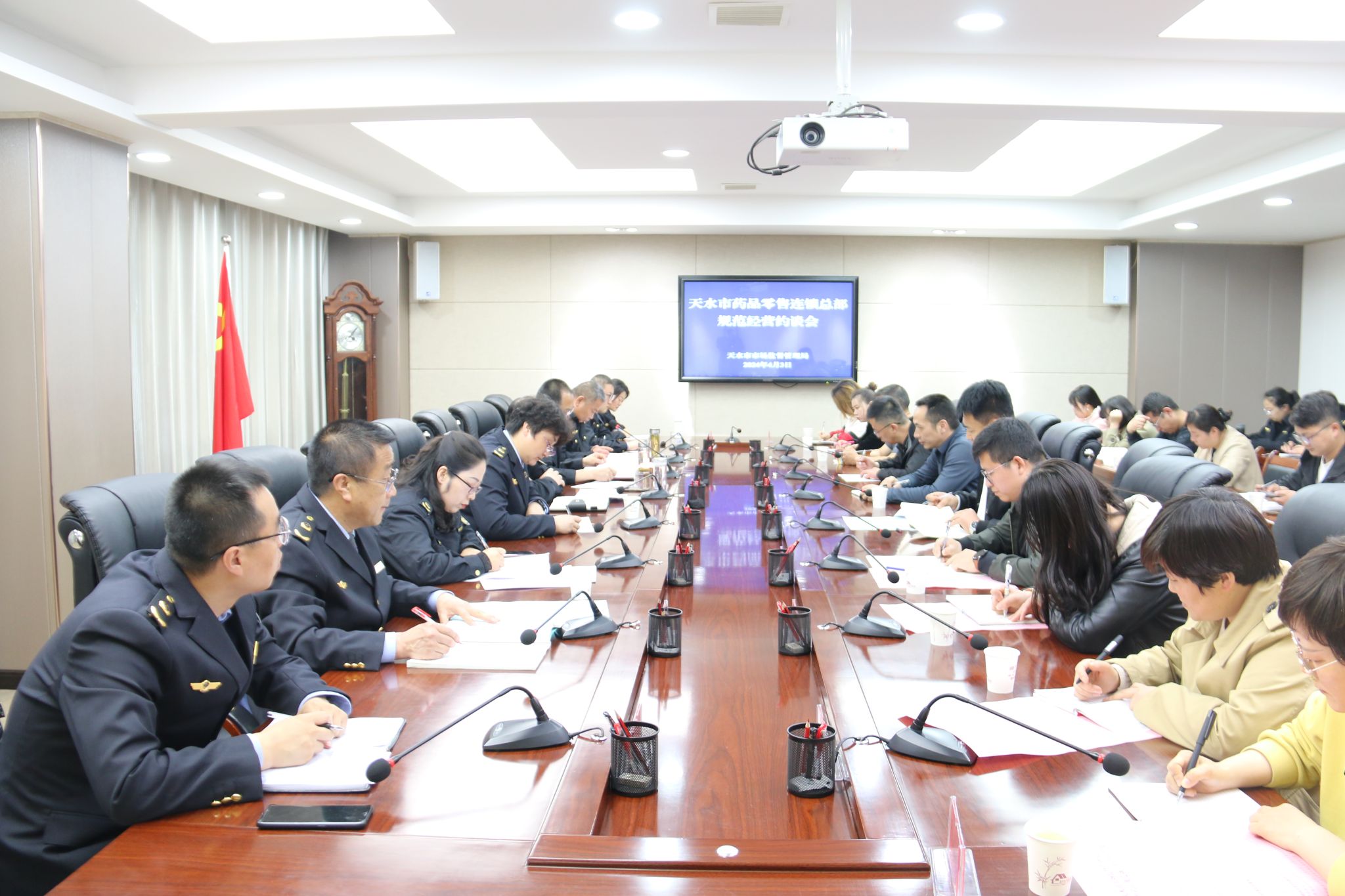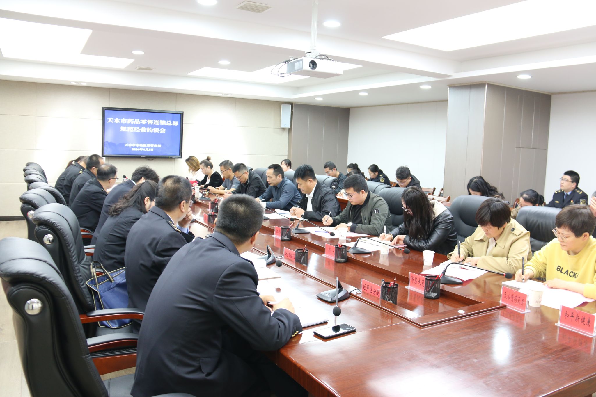 为进一步落实企业主体责任,加强药品零售环节质量安全管理,规范药品流通市场秩序,4月3日,天水市市场监管局联合省药监局天水执法检查局,组织召开全市药品零售连锁总部规范经营约谈会。市市场监管局党组成员、副局长安和平出席会议并讲话,全市药品零售连锁总部企业负责人和质量负责人共计32人参加会议。