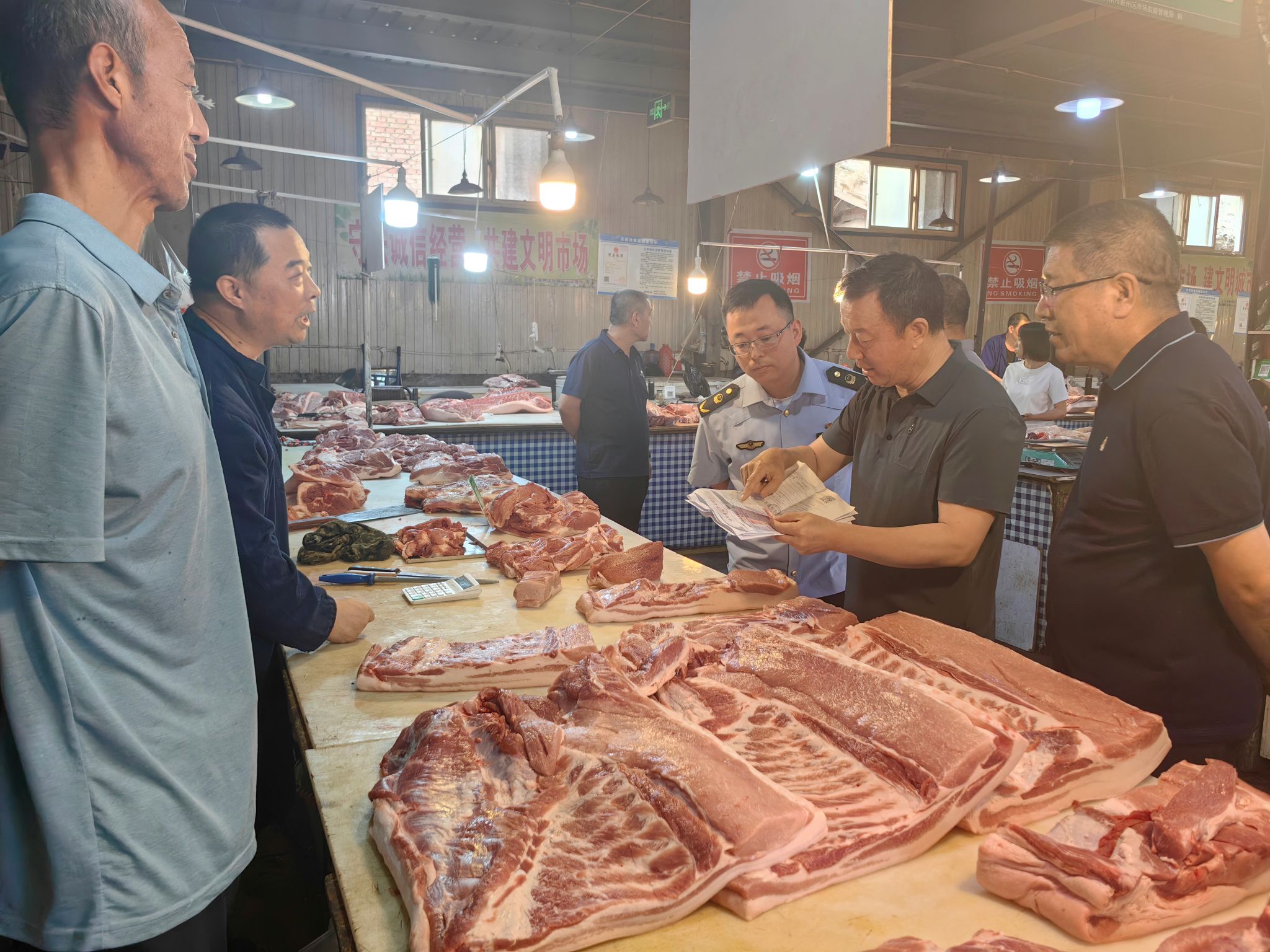 督查组一行先后深入秦州区何记片片香肉夹馍餐饮店、甘肃永辉超市有限公司、秦州区北关综合市场、张家川县甘肃川恒农业发展有限公司、天水益康肉品有限责任公司、伊味思清真食品有限责任公司及张家川在建牛羊屠宰厂等经营主体,现场检查了肉类购进、索证索票、防疫消毒、屠宰检疫、肉品检验、无害化处理、“瘦肉精”检测、投入品使用情况及“日管控、周排查、月调度”机制、索证索票、进货查验台账记录等制度落实情况,对发现的问题现场予以反馈,并提出整改意见。