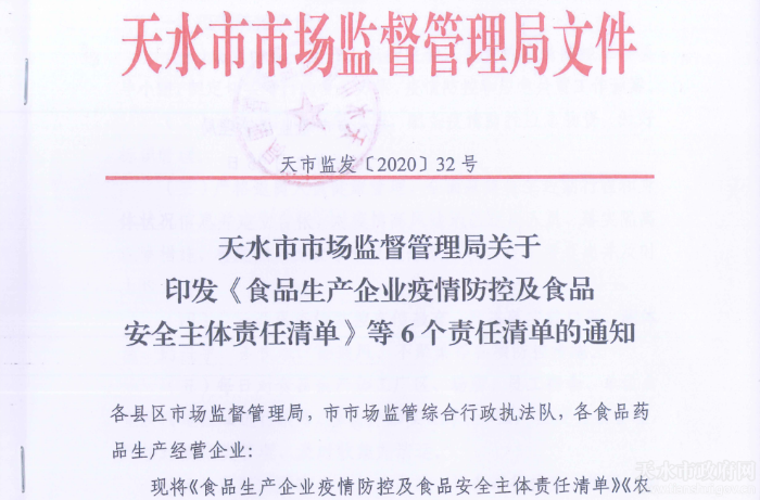 近日,天水市市场监管局出台了《关于< 食品生产企业疫情防控及食品安全主体责任清单>等6个责任清单的通知》,采取分类清单管理的方式,统筹抓好疫情防控和食品药品安全监管,督促指导企业落实主体责任,确保全市人民饮食用药安全。
