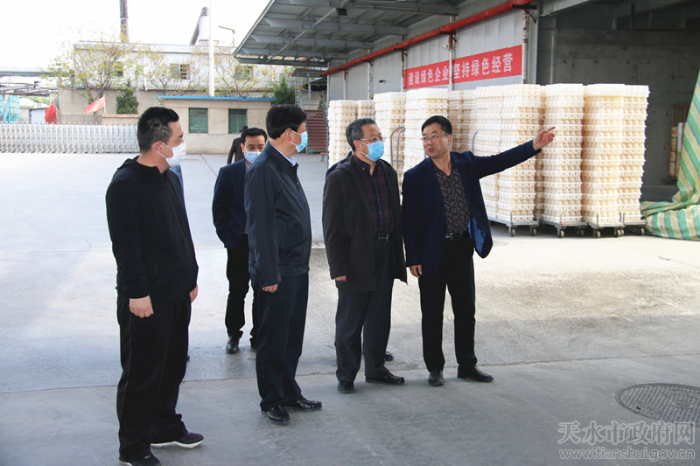 4月15日,省市场监管局党组成员、省纪委监委派驻省市场监管局纪检监察组组长殷正德一行,对天水市企业疫情防控、复工复产、党的建设等情况进行调研指导。天水市市场监管局党组书记、局长王宏玮,天水国家农业科技园区管委会、麦积区市场监管局负责人参加调研。