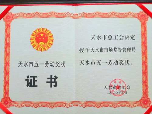 4月28日,在天水市总工会五届九次全委会议暨“五一”劳动奖表彰大会上,天水市市场监管局被天水市总工会授予2020年“天水市五一劳动奖状”荣誉称号。