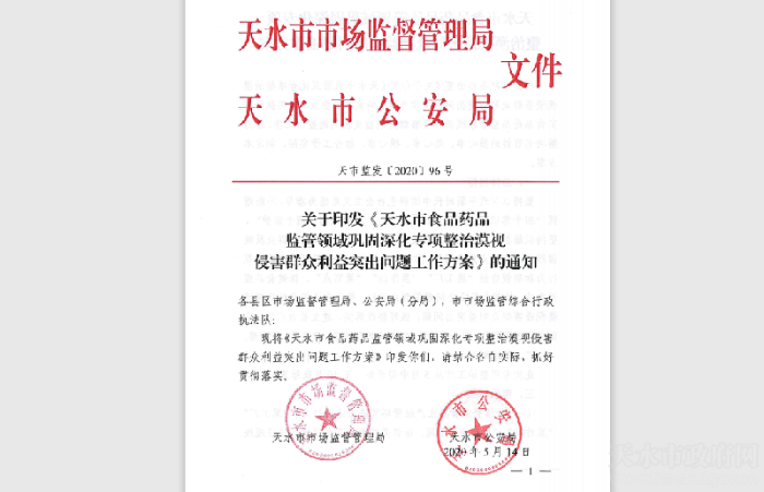 近期,市市场监管局、市公安局联合印发了《天水市食品药品监管领域巩固深化专项整治漠视侵害群众利益突出问题工作方案》(以下简称),部署开展全市食品药品监管领域漠视侵害群众利益突出问题专项整治。