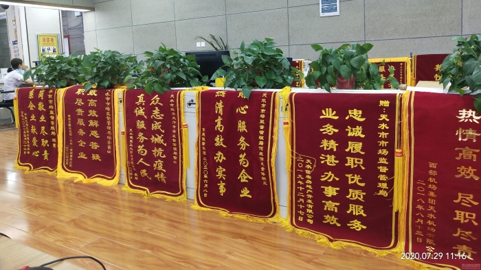 今年以来,天水市市场监管局政务大厅窗口不断加强自身建设,优化办事程序,提升服务效能,围绕疫情防控、复工复产及“六稳”“六保”等中心工作,积极履行审批服务职能。上半年在所有进驻单位窗口综合评比中名列第二,连续3次被评为“红旗窗口”,多名工作人员21次被评为“微笑之星”和“服务之星”,共收到办事企业和群众送来的感谢锦旗8面。在优化营商环境、提升服务水平中赢得了人民群众的广泛赞誉和良好口碑。