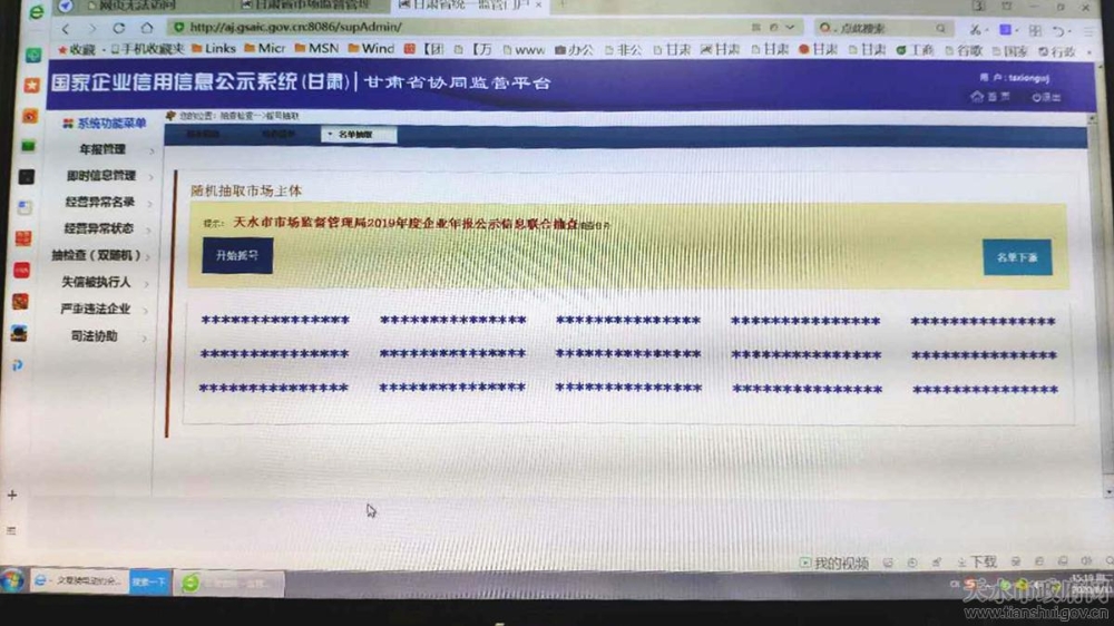 本次抽查,采取省级部门联合下达抽查任务、市级部门联合摇号分派、县级部门联合实施检查的方式,从即日起至2020年10月20日结束。抽查对象为在天水市范围内登记注册,于2020年6月30日24时前通过国家企业信用信息公示系统(甘肃)报送并公示2019年度年报信息的企业。通过系统随机摇号,确定抽查企业933户,抽查比例为3.5%。