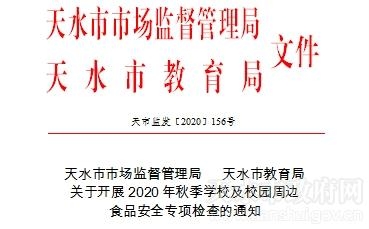2020年秋季开学在即,为进一步加强学校及校园周边食品安全工作,推动学校落实食品安全主体责任,保障师生饮食安全,结合疫情常态化防控有关要求,天水市市场监督管理局与市教育局联合印发《关于开展2020年秋季学校及校园周边食品安全专项检查的通知》,强调“三个突出”,迅速开展校园及周边食品安全专项检查工作。