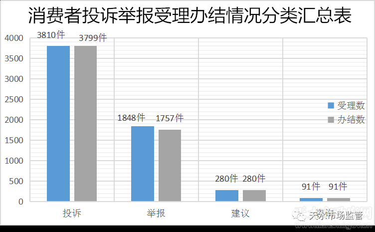 截至目前,共受理消费者反映问题共6029件,其中投诉3810件,办结3799件,办结率95.83%;举报1848件,办结1757件,办结率95.08%;建议280件,咨询91件,均已全部办结。