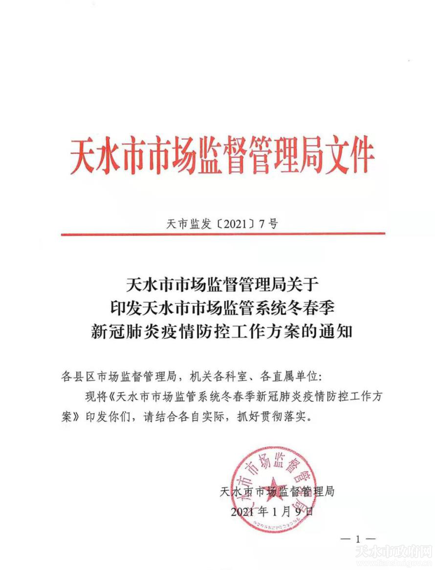 为认真贯彻落实中央和省、市关于统筹推进新冠肺炎疫情防控和经济社会发展的部署要求,进一步压紧压实疫情防控“四方责任”,全面做好市市场监管系统冬春季疫情防控特别是春节期间疫情防控工作,确保全市市场监管工作安全规范、平稳有序运行,近期,天水市市场监督管理局制定下发《天水市市场监管系统冬春季新冠肺炎疫情防控工作方案》(以下简称《方案》),全面安排部署冬春季疫情防控工作。