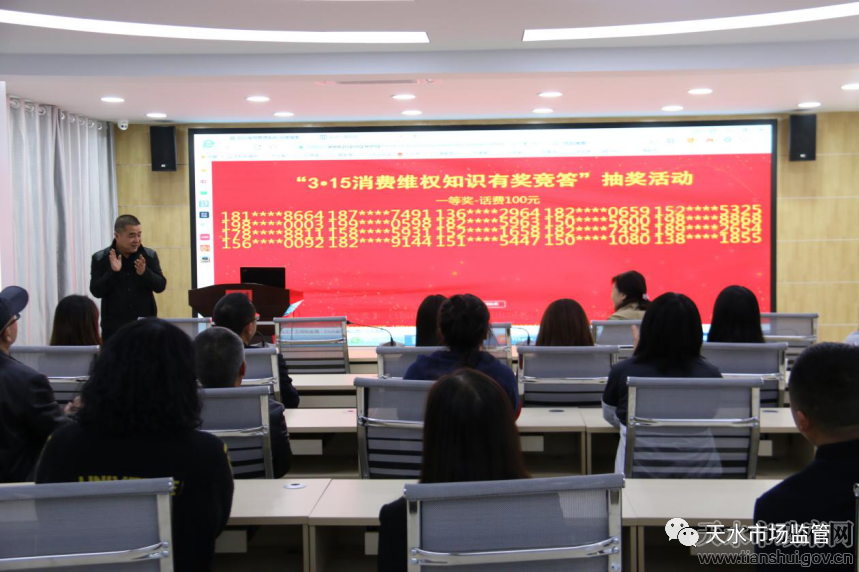 3月25日,天水市市场监督管理局、天水市消费者协会举办了“3·15消费维权知识有奖竞答活动”现场抽奖仪式。市市场监管局党组成员聂惠仁,活动承办单位中国移动通信集团甘肃有限公司天水分公司、中国电信股份有限公司天水分公司、中国联合网络通信有限公司天水市分公司负责同志参加抽奖仪式。