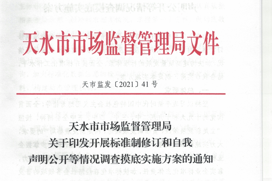 近日,天水市市场监管局印发《开展标准制修订和自我声明公开等情况调查摸底实施方案》,在全市范围内开展标准制修订、标准自我声明公开以及参与国际国内标准化活动等情况的调查摸底工作。