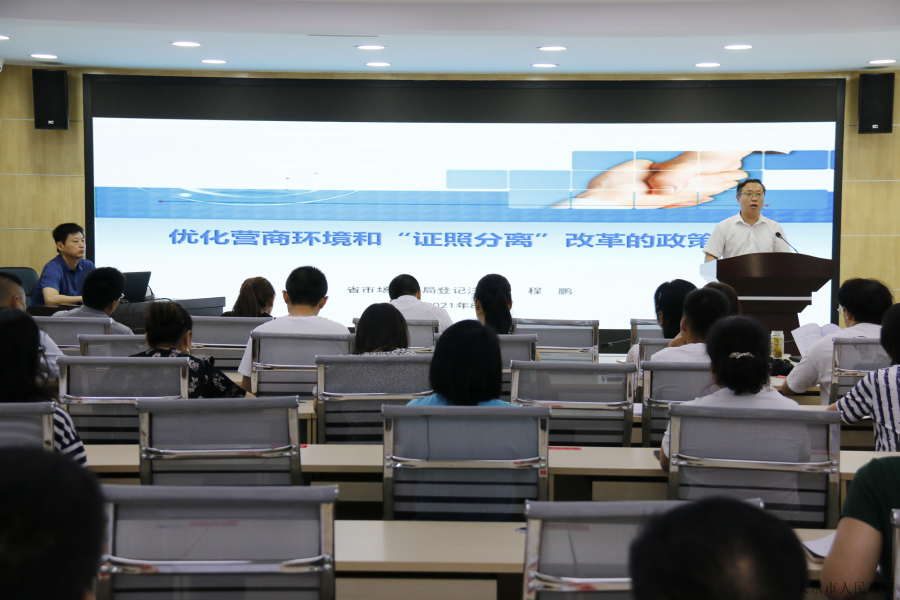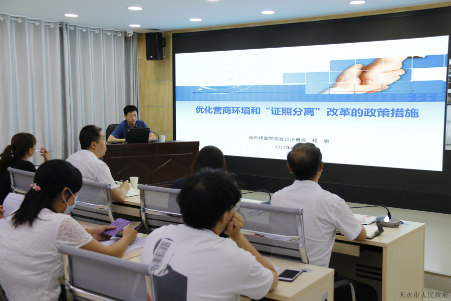 8月2日,“天水市场监管大讲堂”第五讲暨全市“证照分离”改革业务培训会成功举办。本次培训邀请省市场监管局登记注册局局长程鹏作了“优化营商环境和证照分离改革的政策措施”的专题讲座,市局党组成员、副局长贾文斌主持会议,并就进一步推进“证照分离”改革工作提出具体要求。