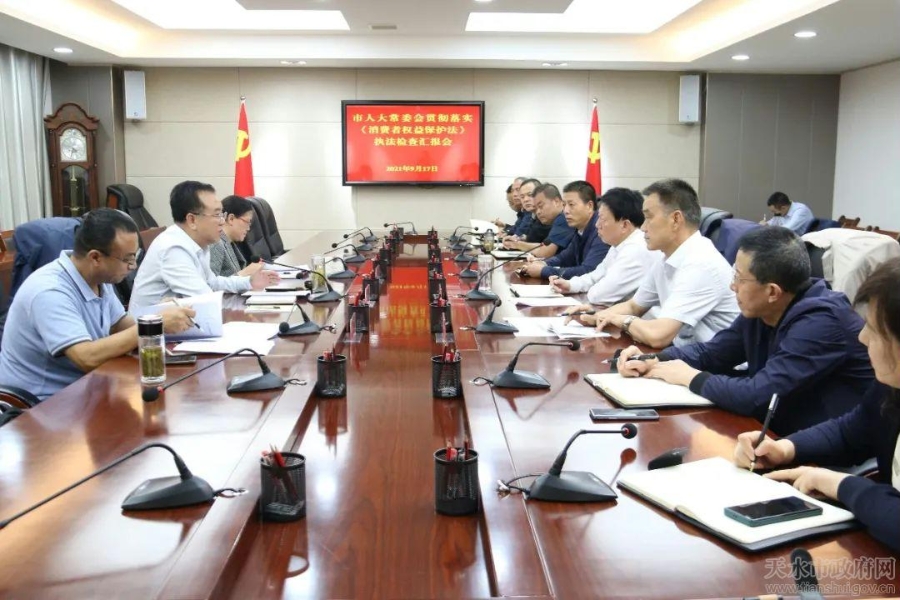 9月15日至17日,天水市人大常委会副主杨永晖带领执法督查组,对《天水市人大常委会关于进一步贯彻实施〈中华人民共和国消费者权益保护法〉和〈甘肃省消费者权益保护条例〉的审议意见》(以下简称《审议意见》)贯彻落实情况开展跟踪督查,市人大财经预算工委及市市场监管局相关负责人参加督查。市市场监督管理局党组书记、局长王宏玮对《审议意见》贯彻落实情况作专题汇报。