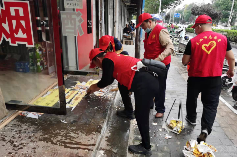 在“包街”路段,所有志愿服务人员明确分工,充分发挥服务职能。一组人员用垃圾钳、扫帚等工具对人行道、公交站等垃圾“重灾区”的果皮纸屑以及绿化带内纸团、饮料瓶等进行清扫,对沿街小广告等城市“牛皮癣”用专用清理剂进行彻底清理。另一组人员对公共场所丢弃烟头等不文明行为当场规劝,针对沿街商铺门口、公交快速干道旁乱停乱放车辆等问题,设置专人“巡逻”,做到随发现,随劝离。