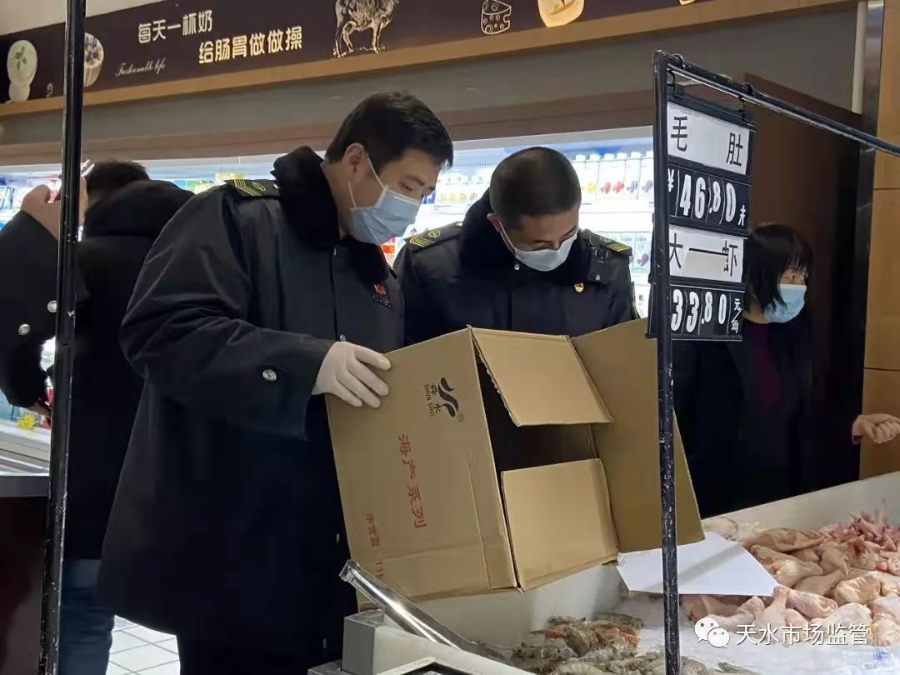 近日,面对复杂严峻的疫情防控工作形势,天水市市场监管局按照“宁可十防九空,不可失防万一”的工作要求,聚焦监管任务,科学精准落实落细防控措施、压紧压实各方责任、持续跟进督促检查,坚持把防范进口冷链食品新冠病毒污染风险作为重中之重,强化“人、物”同检,加强全过程监管,切实保障人民群众生命健康安全。