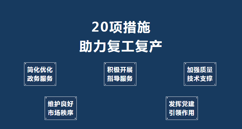 为坚决贯彻习近平总书记重要讲话精神,全面落实市委市政府安排部署以及省局有关要求,充分发挥市场监管职能作用,服务支持市场主体有序恢复生产经营,助力全市经济社会平稳健康发展。11月中旬,天水市市场监督管理局出台《关于应对疫情服务支持市场主体有序复工复产的具体措施》,从简化优化政务服务、支持有序复工复产、优化市场监管服务环境、维护良好市场秩序、发挥党建引领作用5个方面提出20项具体措施。