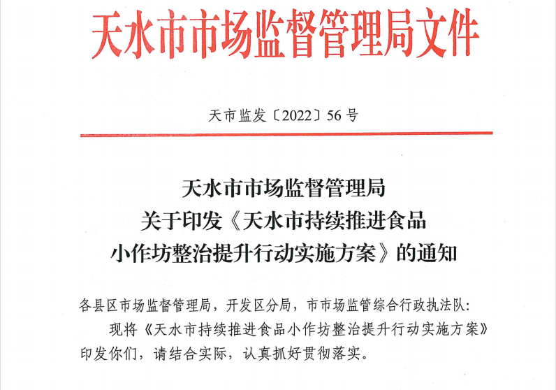 为进一步加强食品小作坊监管,切实保障人民群众舌尖上的安全,近日,天水市市场监管局制定印发了《天水市持续推进食品小作坊整治提升行动实施方案》,在食品小作坊综合治理三年提升(2019-2021)工作基础上,持续开展食品小作坊整治提升行动,防范风险、消除隐患,不断提升全市食品安全水平。
