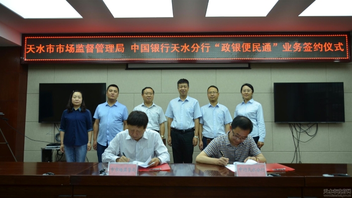 为持续深化“放管服”改革,进一步推进企业登记注册便利化,更好地服务大众创业、万众创新,8月21日,天水市市场监督管理局局长王宏玮和中国银行天水分行行长段宏涛,共同签署双方开展“政银便民通”业务的战略合作协议。这是今年市市场监管局挂牌成立以来持续深化商事制度改革的一项重要行动。