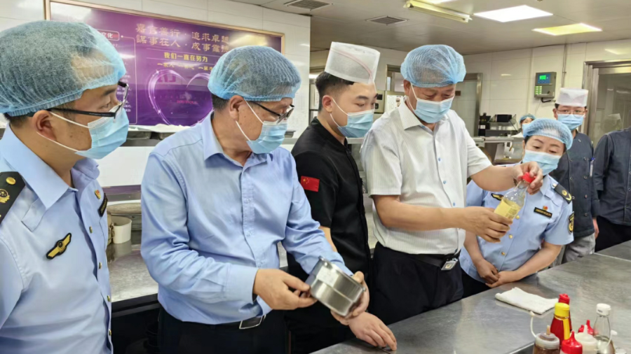 督查组重点检查了酒店工作人员健康管理制度落实情况,详细了解酒店方在人员接待、用餐流程方面的具体措施,查看了酒店在食品进货查验、索证索票、食品留样、明厨亮灶管理及“日管控、周排查、月调度”等方面落实食品安全相关制度的情况。