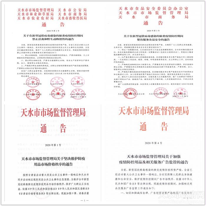 新型冠状病毒感染的肺炎疫情防控工作开展以来,天水市市场监管局深入贯彻落实中央和省、市疫情防控各项工作要求,坚持市局、县区局、乡镇所三级联动,采取七项措施,强化市场监管、稳定商品价格、从快从严查处违法违规行为,从年前到年后,持续奋战在市场监管领域疫情防控一线,积极应对新型冠状病毒肺炎疫情,全力以赴守护人民群众生命安全。