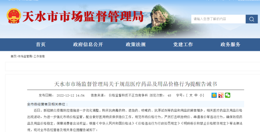及时发布提醒告诫。发布《天水市市场监管局关于规范医疗药品及用品价格行为提醒告诫书》和《关于严厉打击哄抬价格等违法行为的通告》,要求各相关生产经营者严格遵守不得违反明码标价规定、不得哄抬价格、不得价格欺诈等“九不得”要求,提醒经营者公平、合法、诚信经营。同时,对广大生产经营者提出自查和整改要求,并鼓励群众积极举报违法违规线索,推动社会共治。