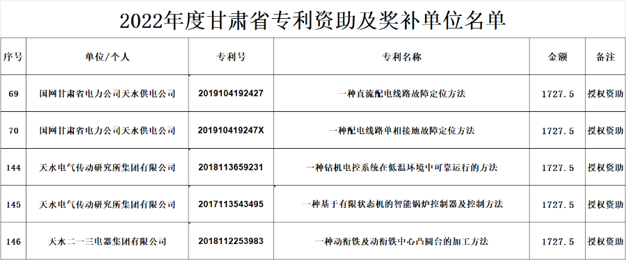 近日,甘肃省知识产权局下发《甘肃省知识产权局关于确定2022年度专利资助及奖补单位名单的通知》,确定全省44家单位为2022年度专利资助及奖补对象,其中我市二一三电器集团有限公司等3家企业的5件发明专利获得资金资助。