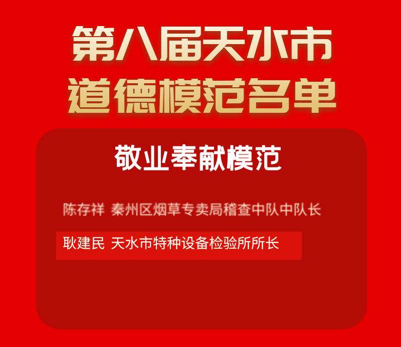 近日,第八届天水市道德模范及提名奖评选结果出炉,市市场监管系统干部耿建民荣获天水市道德模范“敬业奉献模范”称号。