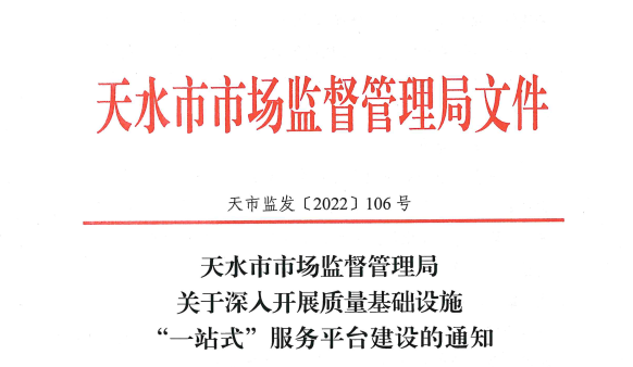 为认真贯彻落实市场监管总局和省市场监管局《关于大力开展质量基础设施“一站式”服务的意见》,近日,天水市市场监督管理局印发《关于深入开展质量基础设施“一站式”服务平台建设的通知》(以下简称《通知》),要求各单位在继续完善“天质惠”一站式质量服务平台建设的基础上,进一步加快融合市场要素资源,创新质量服务模式,强化部门数据联通,全力支持中小微企业提高质量水平、不断壮大发展。