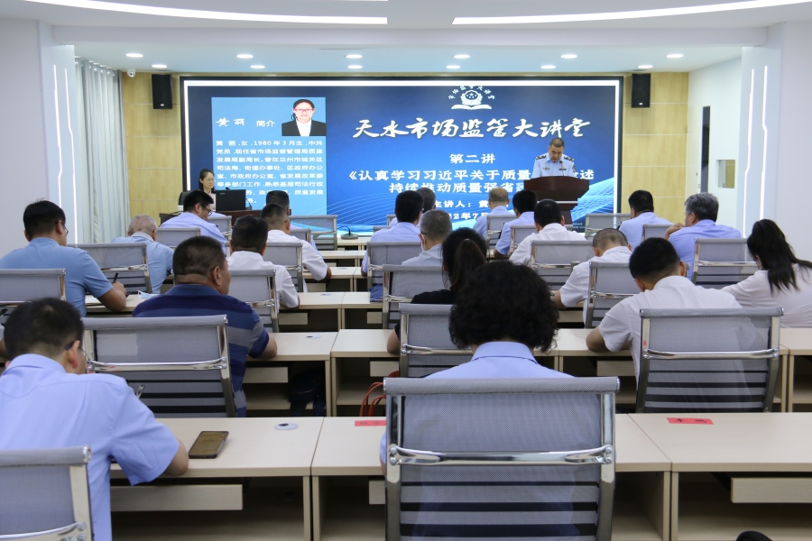 7月4日,2022年“天水市场监管大讲堂”第二讲开讲。大讲堂邀请省市场监管局质量发展局副局长黄丽,围绕习近平总书记关于质量工作的重要论述,就持续推动质量强省建设进行专题授课。市局党组成员聂惠仁主持大讲堂。