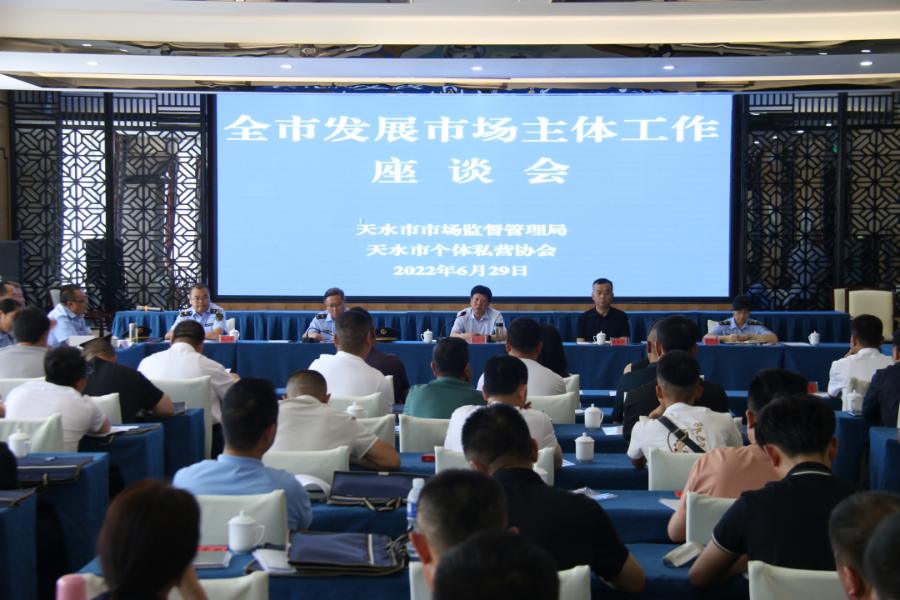 按照全市“作风建设年”活动部署要求,为深入了解市场主体发展面临的困难和问题,全力破解当前市场主体发展难题,6月29日,天水市市场监管局、市个体私营协会组织召开了全市发展市场主体工作座谈会。市局党组书记、局长王宏玮出席会议,省个私协会副秘书长张葆明到会指导,市局党组成员、副局长贾文斌主持会议。各县区市场监管局分管领导、相关股室负责人及来自全市五县两区的私营企业负责人和个体工商户代表共80余人参加会议。