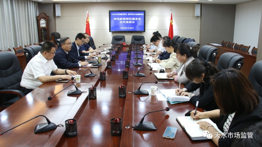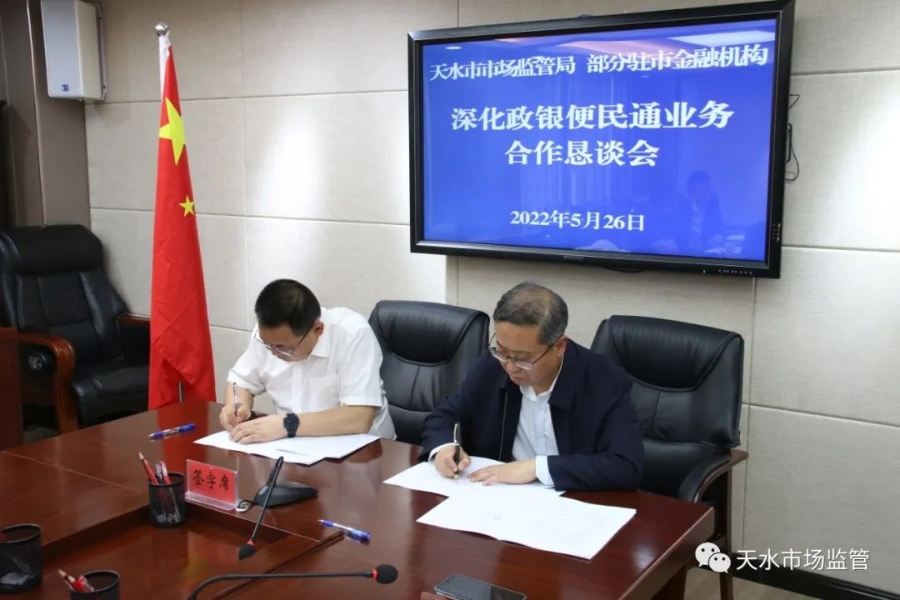 5月26日,我市深化政银便民通业务合作恳谈会在天水市市场监督管理局举行。市市场监管局党组成员、副局长贾文斌同志及兰州银行、邮储银行、浙商银行天水分行分管领导出席会议,并签署了“深化政银便民通”业务合作意见书。