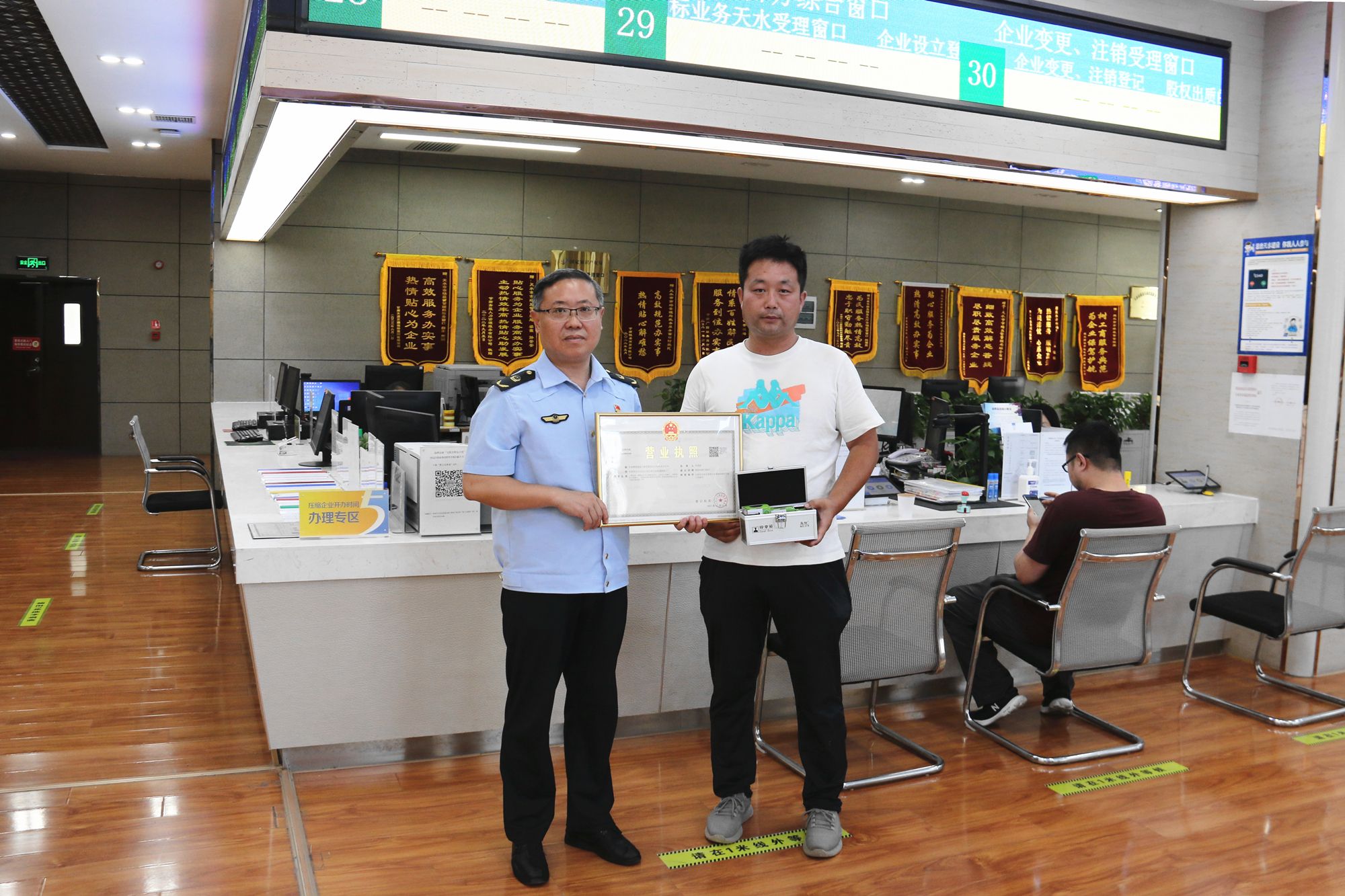 7月4日,天水市市场监督管理局党组成员、副局长贾文斌向新开办企业——甘肃腾盛建筑工程有限责任公司天水分公司发放了一套包括公章、财务专用章、负责人章在内的3枚印章,这是我市为新开办企业开展“政府买单送章”服务的首套印章。“办理营业执照不仅没有花一分钱,还免费赠送了一套印章,你们的服务真是太贴心了!”拿到首套印章后,该公司负责人李强强连连称赞。