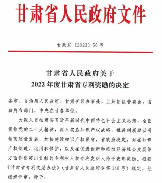 近日,甘肃省市场监督管理局公布2022年甘肃省专利奖名单,我市有3项专利获省专利奖。