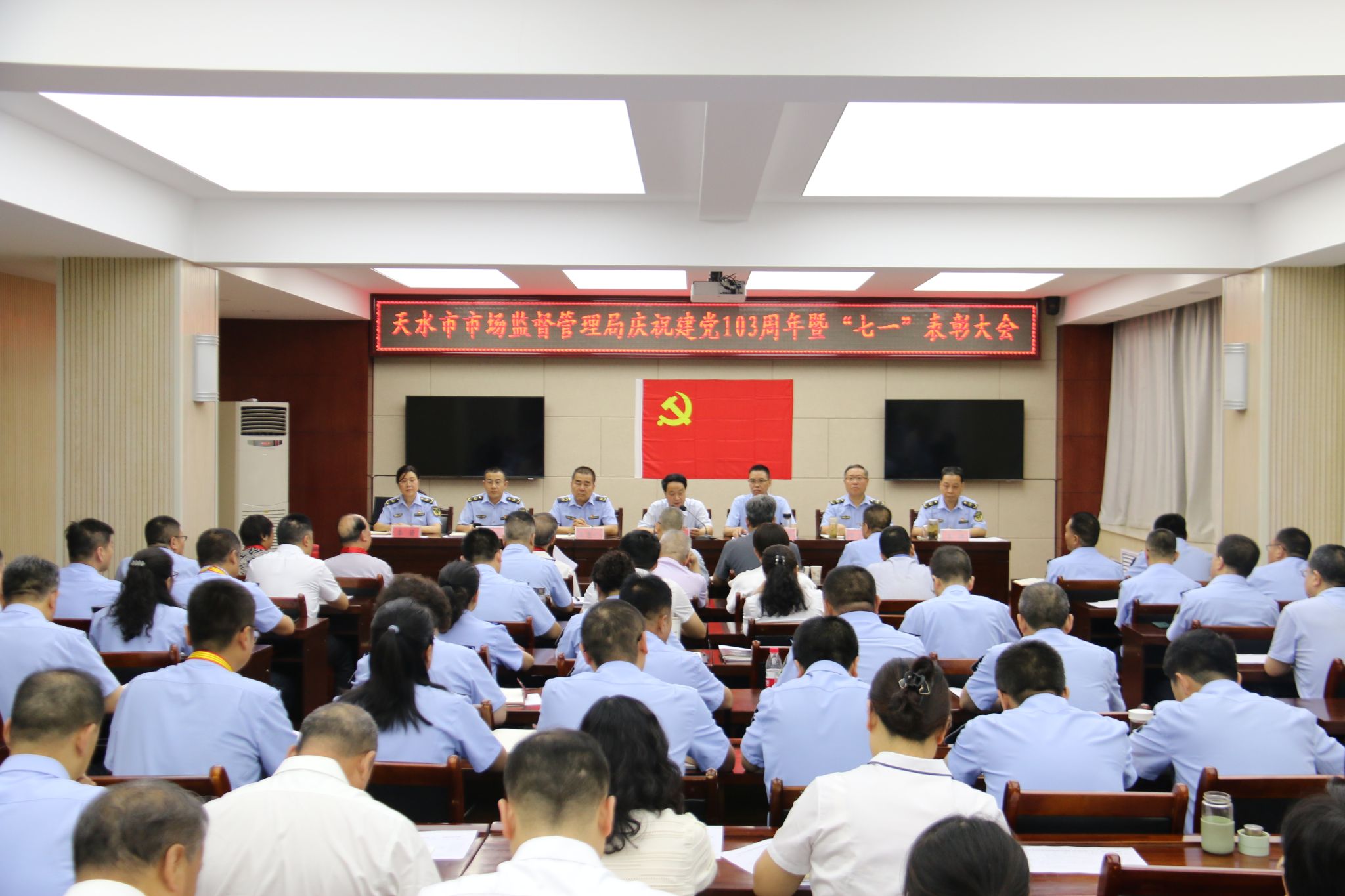 6月28日上午,天水市市场监管局召开庆祝建党103周年暨“七一”表彰大会。局党组书记、局长董小明出席会议并讲话。局领导班子成员,退休党员干部代表、机关科级以上党员干部、局属各单位领导班子成员、各党支部书记、局系统优秀共产党员和优秀党务工作者,共计90余人参加会议。