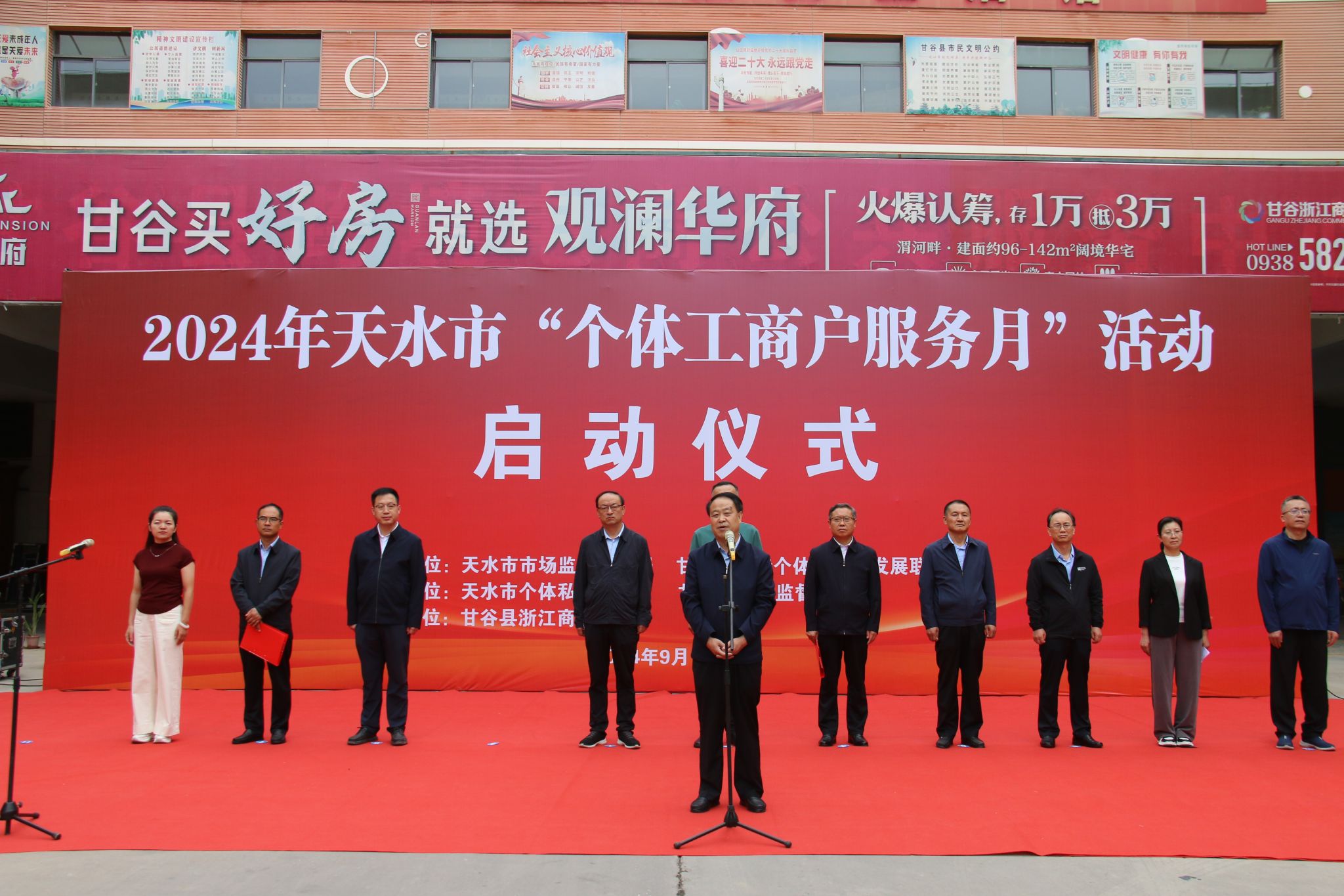 近日,天水市市场监管局联合甘谷县扶持个体工商户发展联席会议,在甘谷县浙江商贸城举办了天水市第三届“个体工商户服务月”启动仪式暨集中宣传服务活动。市级联席会议副召集人、市政府办公室副主任李逢春出席活动并宣布“服务月”活动启动,省个私协会副秘书长张葆明应邀出席启动仪式并指导宣传服务活动,市级联席会议副召集人、市市场监管局局长董小明作了动员讲话。