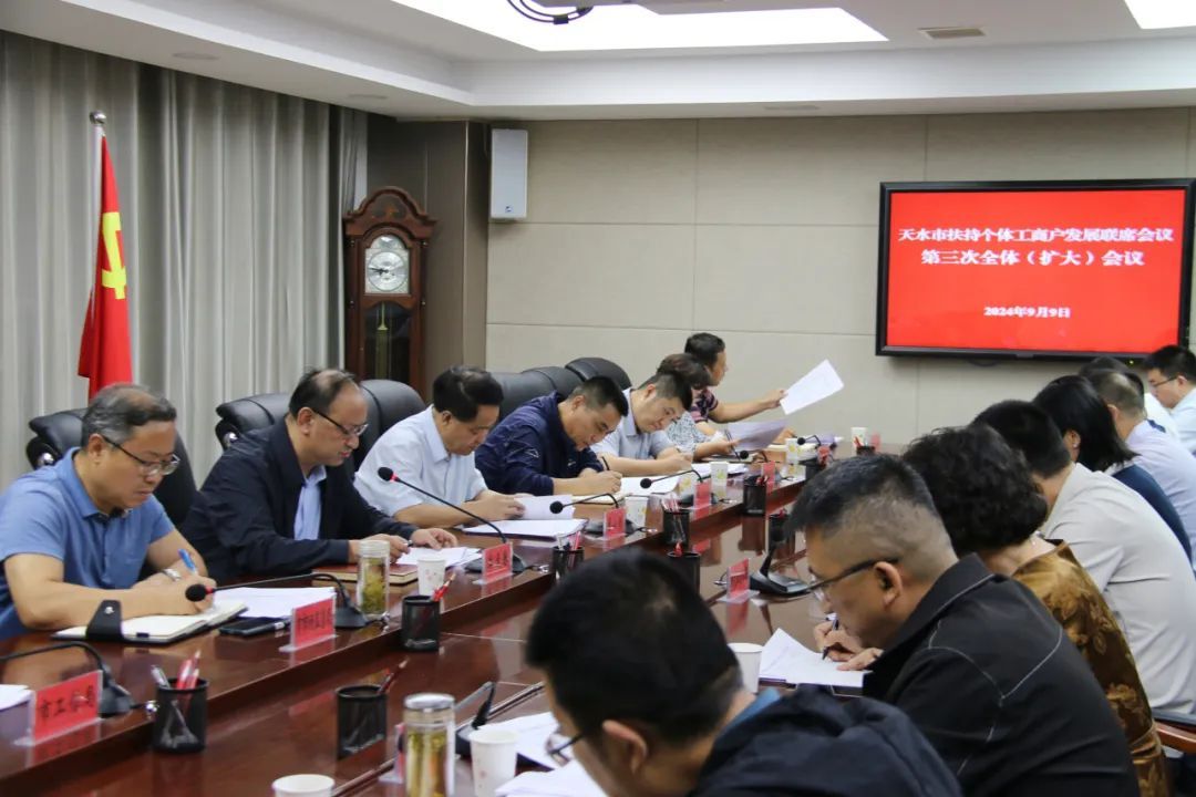 会上,传达学习了习近平总书记关于促进民营经济健康发展的重要讲话重要指示批示,宣读了调整天水市扶持个体工商户发展联席会议机制文件,解读了《天水市个体工商户分型分类精准帮扶实施方案》,审议通过了《2024年天水市“个体工商户服务月”活动方案》,对联席会议下一阶段工作和“个体工商户服务月”活动作了安排部署。