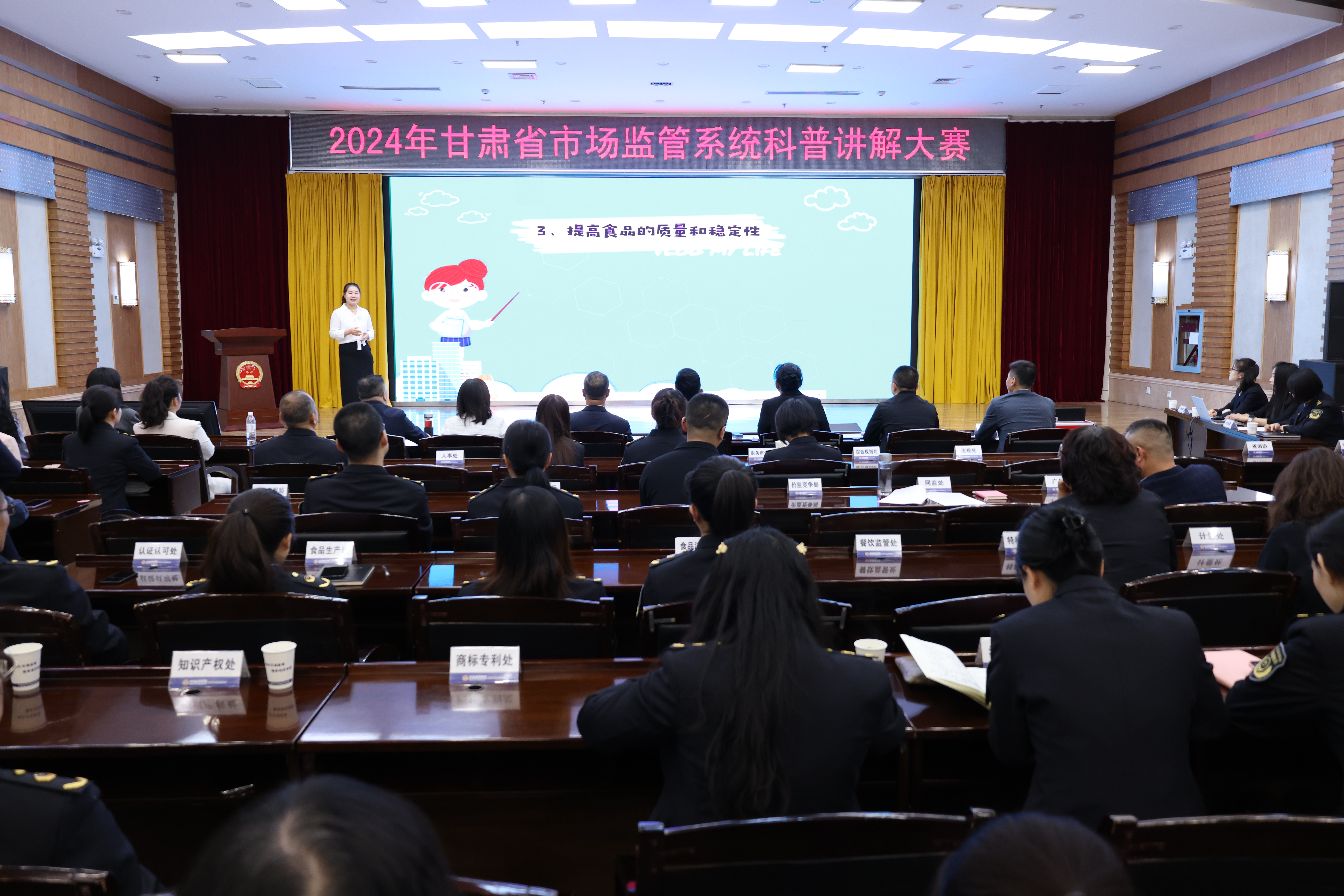 省局副局长李雪楠、一级巡视员王庆邦,二级巡视员吴恭敬,省科技厅人才与科学普及处四级调研员潘益纲及省局相关处(室)局主要负责人担任评委并为获奖选手颁奖。本次比赛共有30个单位的41名选手报名参赛,20名选手脱颖而出进入决赛,经过激烈角逐,综合评估内容陈述、表达效果、整体形象等各项得分,兰州市食药检院王露莹、西峰区市场监管局张以珊等10名选手分获一、二、三等奖,其余选手分获创意奖、风采奖和优秀奖。