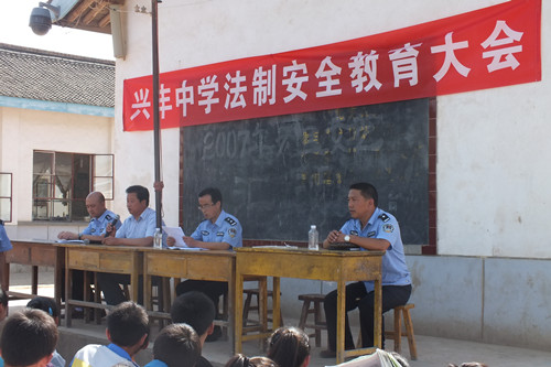 司法所伏双吉用近期发生的青少年犯罪案例说明法制在生活当中的重要性,告诫学生们要树立正确的价值观、人生观,要珍惜现有生活,希望同学间多一些理解、宽容、忍让,要加强法治观念,走正确的人生道路。兴丰派出所副所长郭继银同志就校园安全建设、交通安全知识、中学生安全意识的培养、校园中的案例等进行了详细的讲解,讲解《治安管理处罚法》。教育学生严格遵守学校规章制度,在学好科学文化知识的同时,自觉抵御不良诱惑,做一个知法、懂法、守法的好学生、好公民。