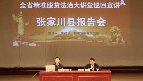 为深入学习贯彻党的十九大和全国两会精神,切实发挥法治宣传教育在精准扶贫中的基础性作用,为精准扶贫、精准脱贫营造良好的社会法治环境。 5月22日上午,在张家川县影视中心举行全省精准脱贫法治大讲堂巡回宣讲张家川县报告会,在大讲堂上省委党校曹建民教授为广大扶贫干部作了《依法促进和保障精准扶贫》的专题辅导讲座。报告会由张家川县委常委、政法委书记高建平同志主持,参加今天报告会的有全县各乡镇主要领导、分管领导,县直及驻县市属各单位主要负责人,省市县驻村帮扶工作队队长、贫困村第一书记和村支部书记,群众代表,县司法局全体干部,共510多人聆听了本次讲座。