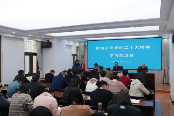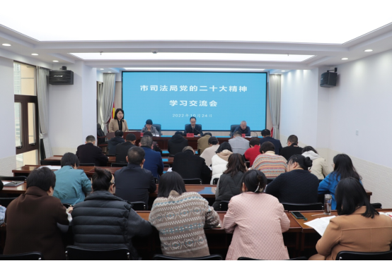 会议强调,全体党员干部要把学习好、宣传好、贯彻好党的二十大精神,作为当前和今后一个时期的重要政治任务,要迅速行动起来,掀起学习热潮,切实把思想和行动统一到党的二十大精神上来,形成党组书记带头谈、党员代表结合谈、先进典型对照谈、法律服务工作者专题谈、年轻干部轮流谈,原原本本学、线上自主学、氛围营造学、研讨交流学,结合深入学习贯彻习近平总书记对甘肃重要指示要求、持续学习贯彻习近平法治思想、认真学习贯彻省第十四次党代会精神。要把学习效果体现在工作实效上,以党的二十大精神为指引,为推进全面依法治市和司法行政工作高质量发展贡献力量。