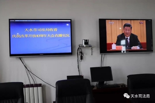 12月18日,天水市司法局组织机关党员和干部职工集中收看了庆祝改革开放40周年大会直播,认真聆听了习近平总书记的重要讲话,共同感受祖国的强劲脉搏和辉煌成就。