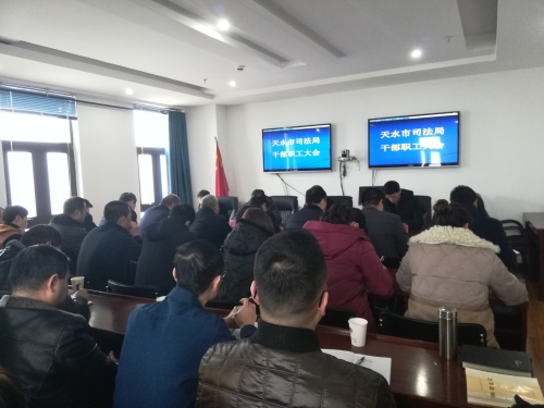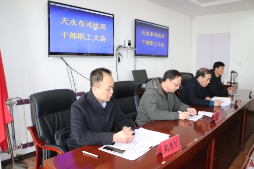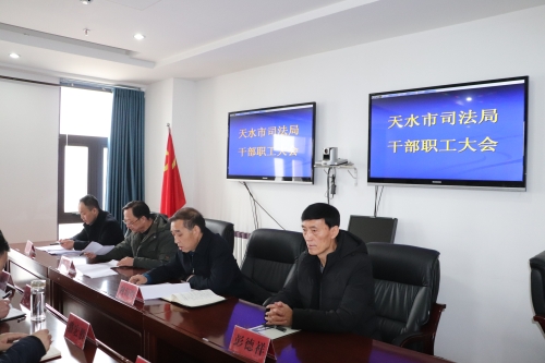 2月19日,天水市司法局召开干部职工大会,宣布重新组建的市司法局领导班子。会议由市委组织部干部三科科长刘彦军主持,市委组织部副部长剡海明出席会议并作讲话。原市司法局及原市政府法制办全体干部职工,忠信律师事务所、市公证处负责人共60余人参加会议。