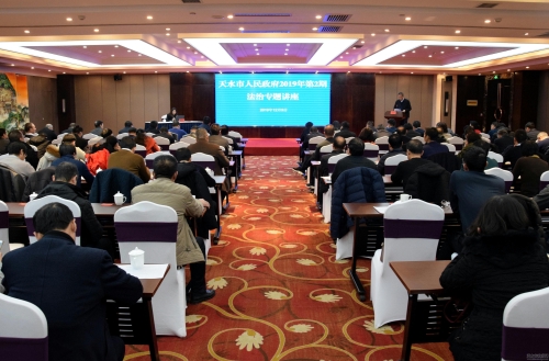 “宪法宣传周”启动以来 ,天水市开展了丰富的主题宣传活动。12月3日,市政府举办了2019年第二期政府系统领导干部法治专题讲座,旨在深入学习贯彻党的十九届四中全会精神、推动领导干部加强宪法学习,增强宪法意识。讲座邀请甘肃政法大学俞金香教授作专题辅导,市政府副秘书长左绍君主持讲座并讲话。各县区政府、开发区管委会、市政府各部门、市属及驻市有关单位领导干部约120余人聆听了讲座。