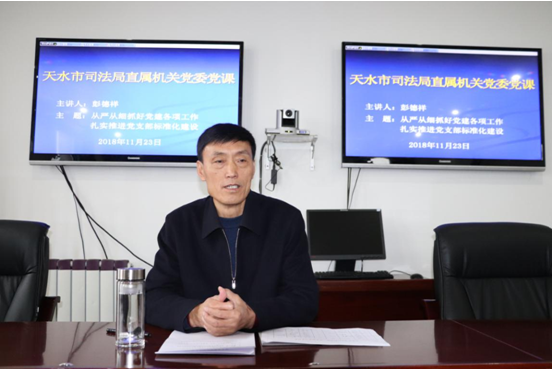 11月23日上午,天水市司法局直属机关党委开展书记讲党课活动,主要传达全市党支部标准化建设工作要求。局党组书记、局长、直属机关党委书记彭德祥同志讲了以“从严从细抓好党建各项工作,扎实推进党支部标准化建设”为主题的专题党课,局机关第一党支部、局机关第二党支部、市公证处党支部、忠信律师事务所党支部全体党员参加。