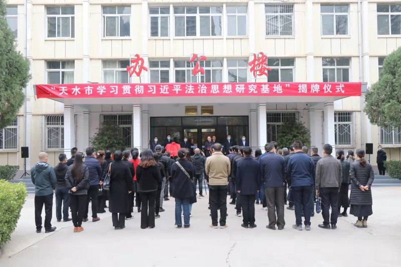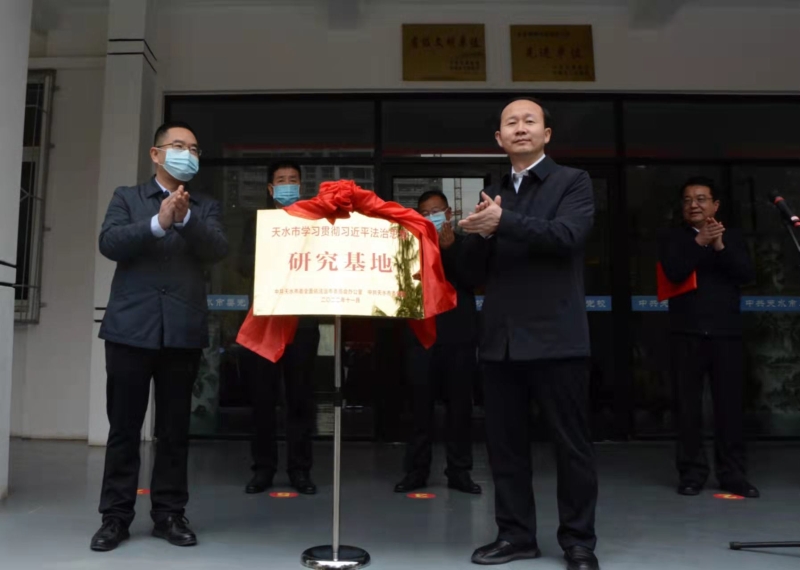 11月17日,天水市委依法治市办在市委党校举行“天水市学习贯彻习近平法治思想研究基地”揭牌仪式。市委常委、政法委书记、市委全面依法治市委员会办公室主任邵建斌出席仪式并讲话。副市长、市公安局局长郭庆祥主持,市中级法院院长张志利、市检察院检察长杨耀明出席揭牌仪式。